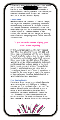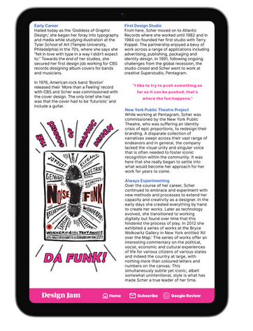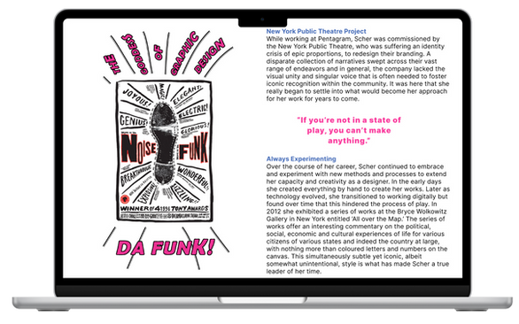 Building on this exploration of Paula Scher’s bold and experimental design approach, this project translates the article into a responsive digital format that adapts seamlessly across desktop, tablet, and mobile. The goal was to preserve the article’s energetic personality and typographic expression while reshaping it into a functional, well-structured web experience. Through experimenting with layout systems, hierarchy, and interactive elements, the design reflects Scher’s dynamic visual language without compromising usability. The outcome presents a cohesive and engaging digital interpretation that remains true to the essence of the original article.